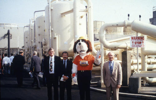 Unidentifed Event at Power Plant Facility Event with Bob Bowne and two unidentified men pose with the Dog Mascot for the Burbank Water and Power Department.