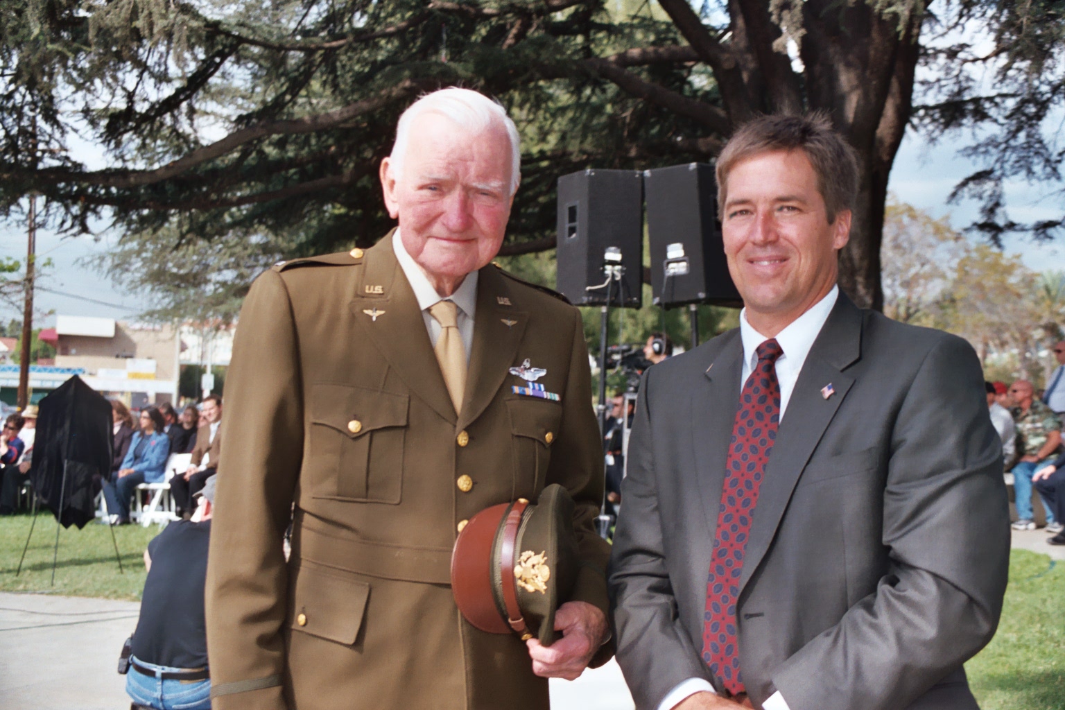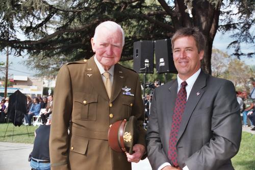 City councilman Dave Golosnki poses with an unidentified veteran at the annual Veteran's Day Ceremony at McCambridge Park.